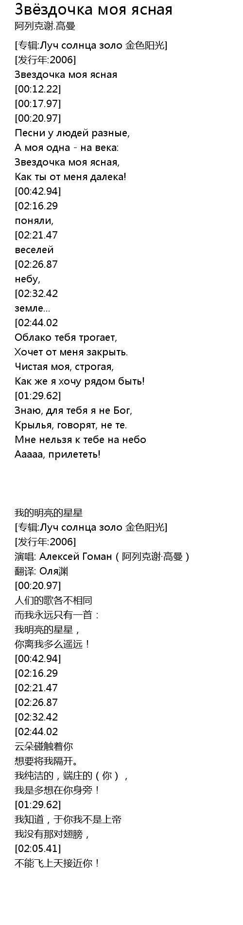 | [00:12.22] | 演唱: Алексей Гоман(阿列克谢·高曼) |