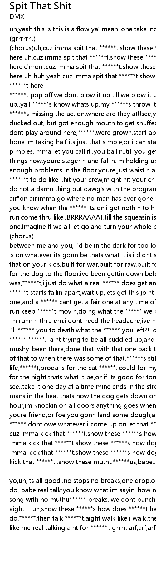 (chorus)uh,cuz imma spit that ******t.show these ******s how dog does ******t here.uh,cuz imma spit that ******t.show these ******s how dog does ******t here.c'mon..cuz imma spit that ******t.show these ******s how dog does ******t here.uh huh yeah cuz imma spit that ******t.show these ******s how dog does ******t here. |