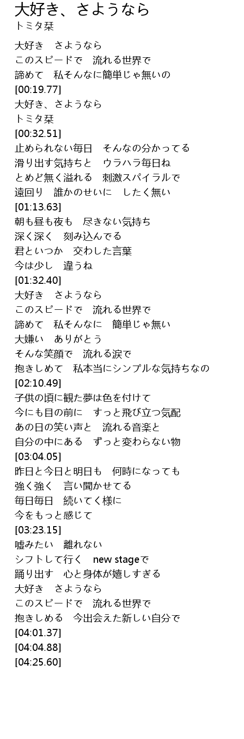 | [03:51.43] | 抱きしめる 今出会えた新しい自分で |