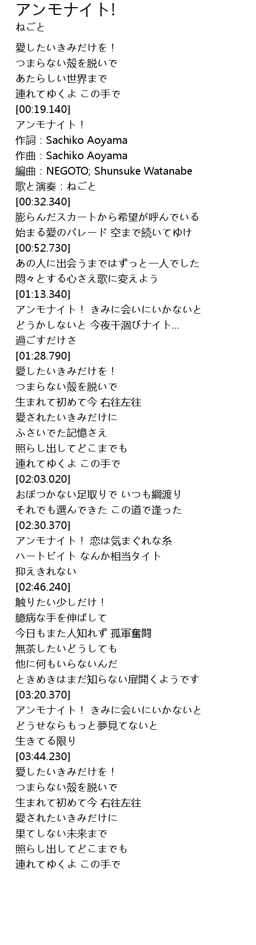 | [00:26.810] | 編曲:NEGOTO; Shunsuke Watanabe |