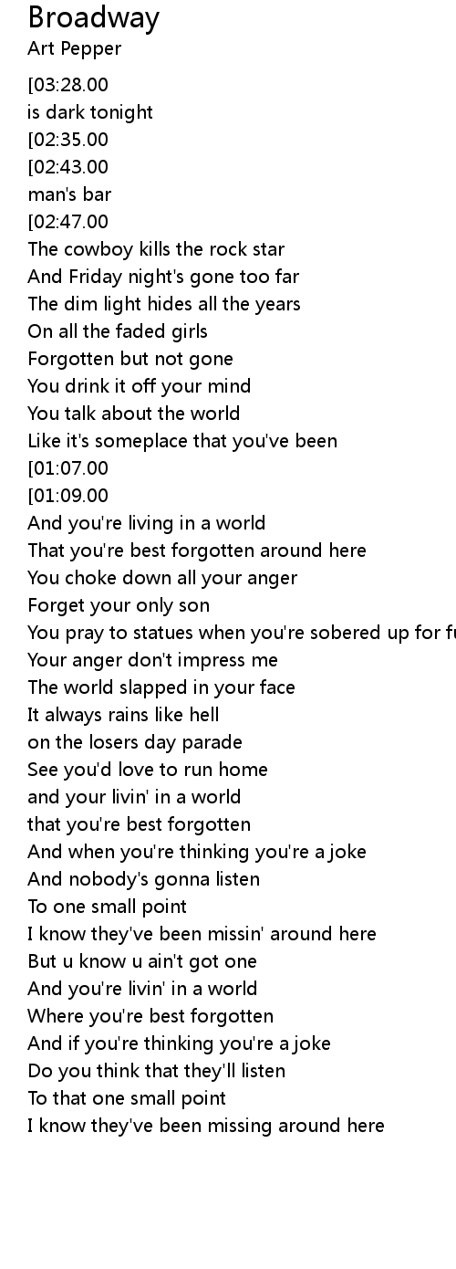 [03:35.00][03:28.00][02:38.00][02:31.00][01:26.00][01:19.00][00:21.00][00:13.00] Broadway is dark tonight