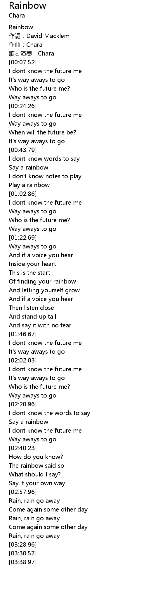 | [03:10.23] | Rain, rain go away |