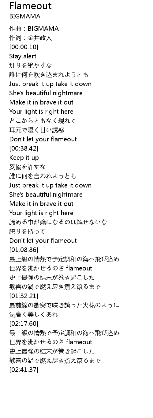 | [02:26.46] | 世界を沸かせるのさ flameout |