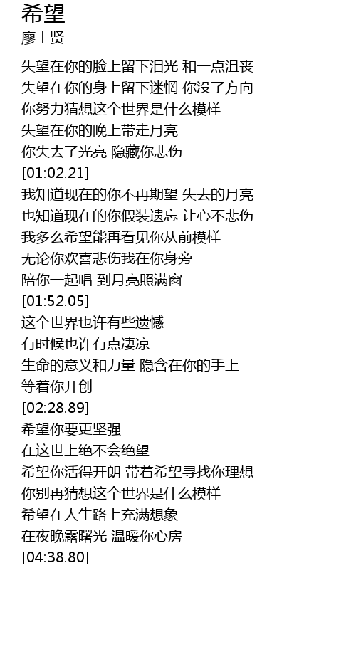 | [04:04.18] | 希望你活得开朗 带着希望寻找你理想 |