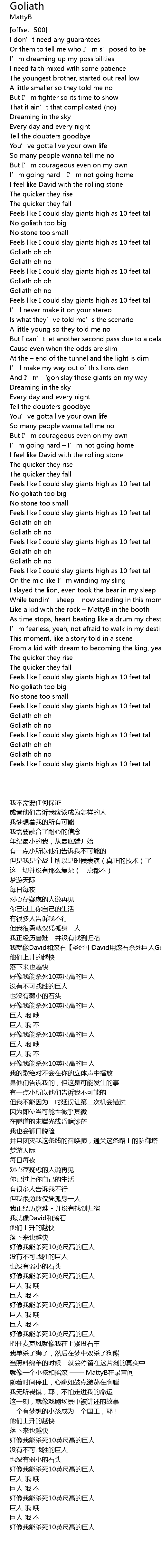 | [00:46.81] | 我就像David和滚石【圣经中David用滚石杀死巨人Goliath】 |