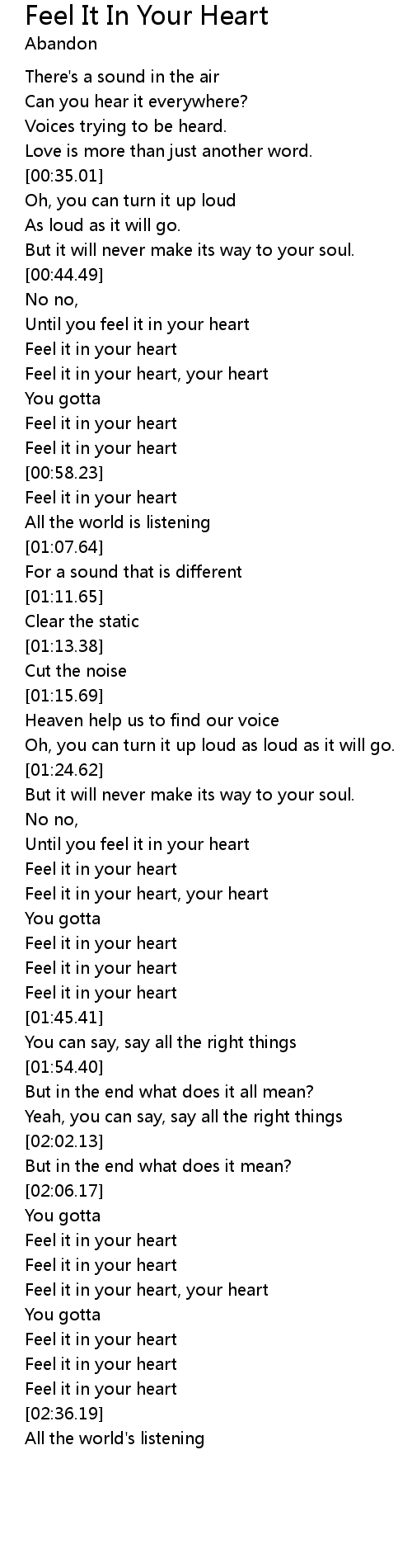 | [02:33.00] | Feel it in your heart |