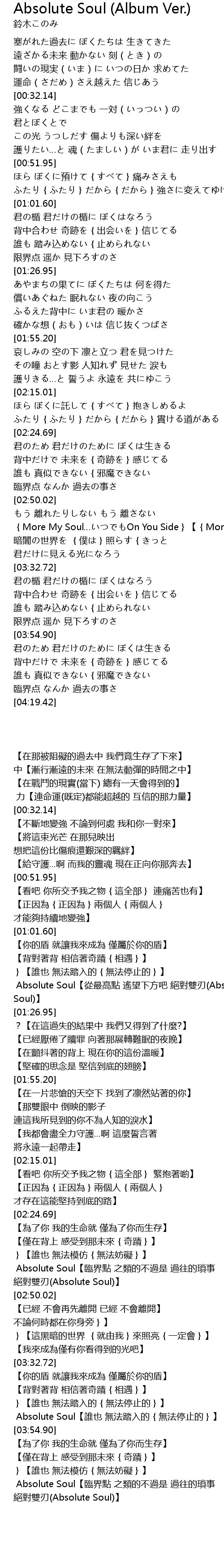 | [03:48.52] | Absolute Soul【誰也 無法踏入的{無法停止的}】 |
