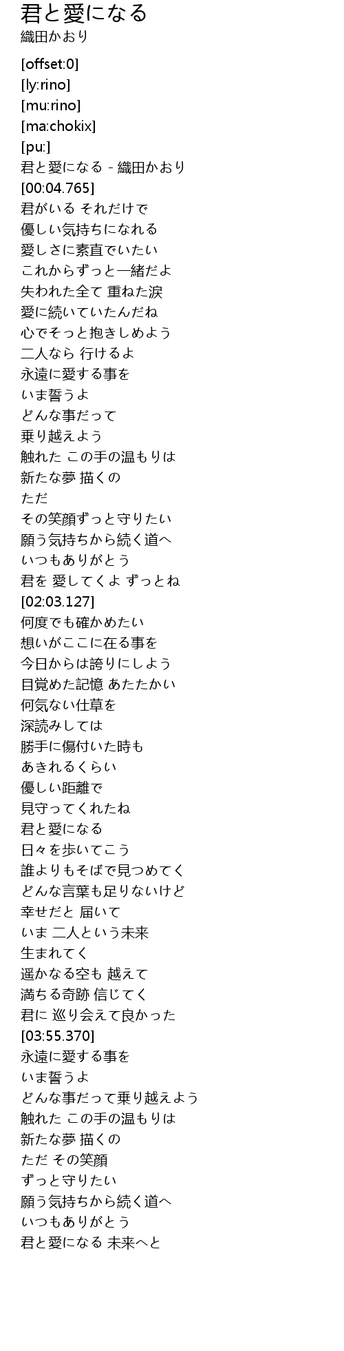 | [00:00.005] | 君と愛になる - 織田かおり |