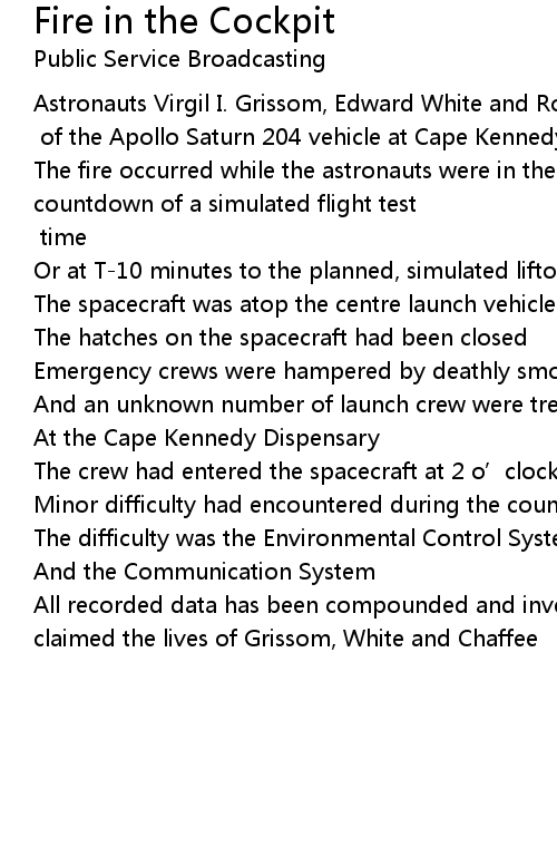 | Astronauts Virgil I. Grissom, Edward White and Roger Chaffee were killed tonight during [?] of the Apollo Saturn 204 vehicle at Cape Kennedy | |