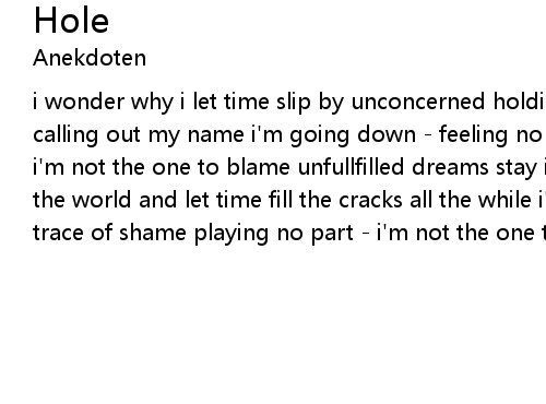 | i wonder why i let time slip by unconcerned holding my breath while life's calling out my name i'm going down - feeling no trace of shame playing no part - i'm not the one to blame unfullfilled dreams stay intact here inside shut out the world and let time fill the cracks all the while i'm going down - feeling no trace of shame playing no part - i'm not the one to blame |