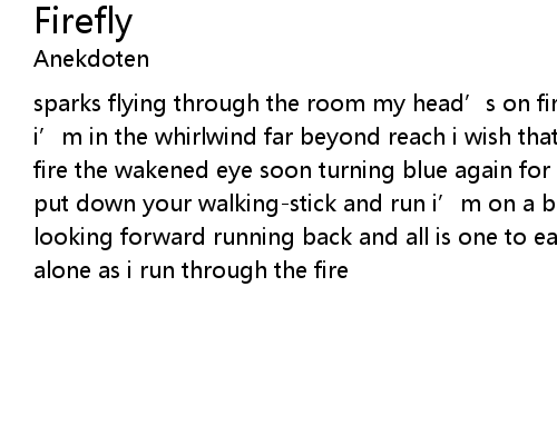 | sparks flying through the room my head' s on fire and there is nothing i can do i' m in the whirlwind far beyond reach i wish that you would be here too fading fire the wakened eye soon turning blue again for all gone before all left undone put down your walkingstick and run i' m on a blindride all screens are blank looking forward running back and all is one to each his own all is one but i am alone as i run through the fire |