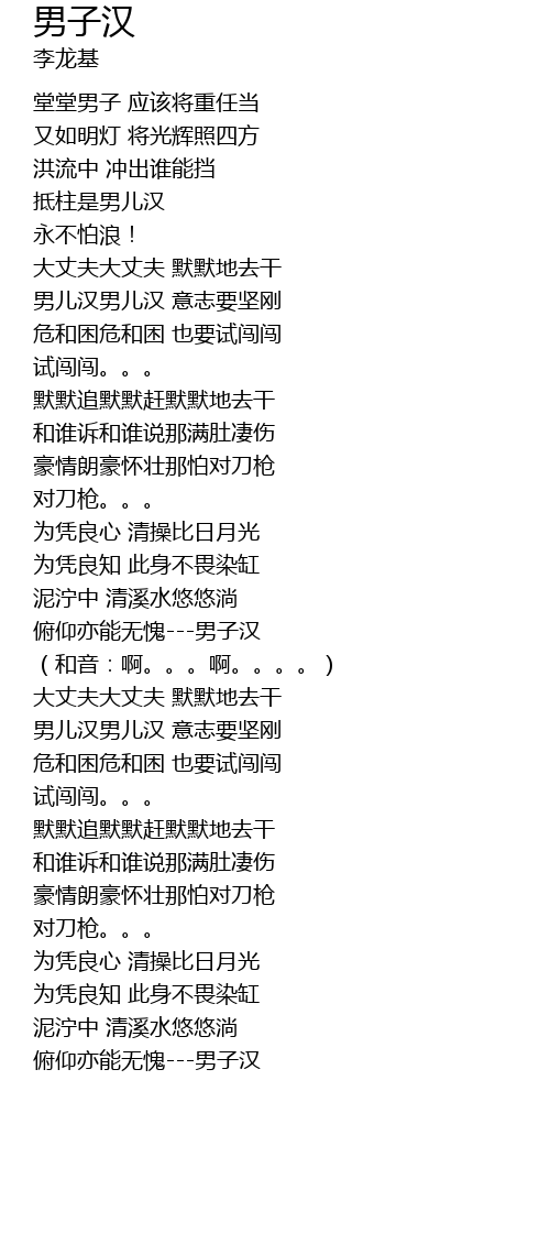 | [00:49.50] | 男儿汉男儿汉 意志要坚刚 |