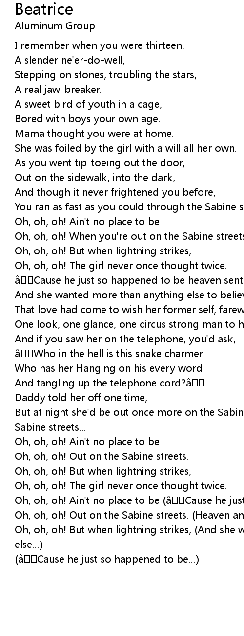 | Oh, oh, oh! When you' re out on the Sabine streets. | |
