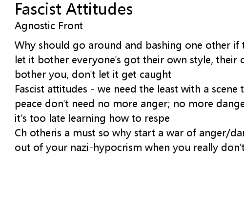 Fascist attitudes - we need the least with a scene that's fighting for unity's peace don't need no more anger; no more danger don't need to hate;stop before it's too late learning how to respe |
