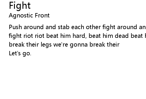 | Push around and stab each other fight around and kill each other fight fight fight riot riot beat him hard, beat him dead beat him harder, beat him down break their legs we're gonna break their | |