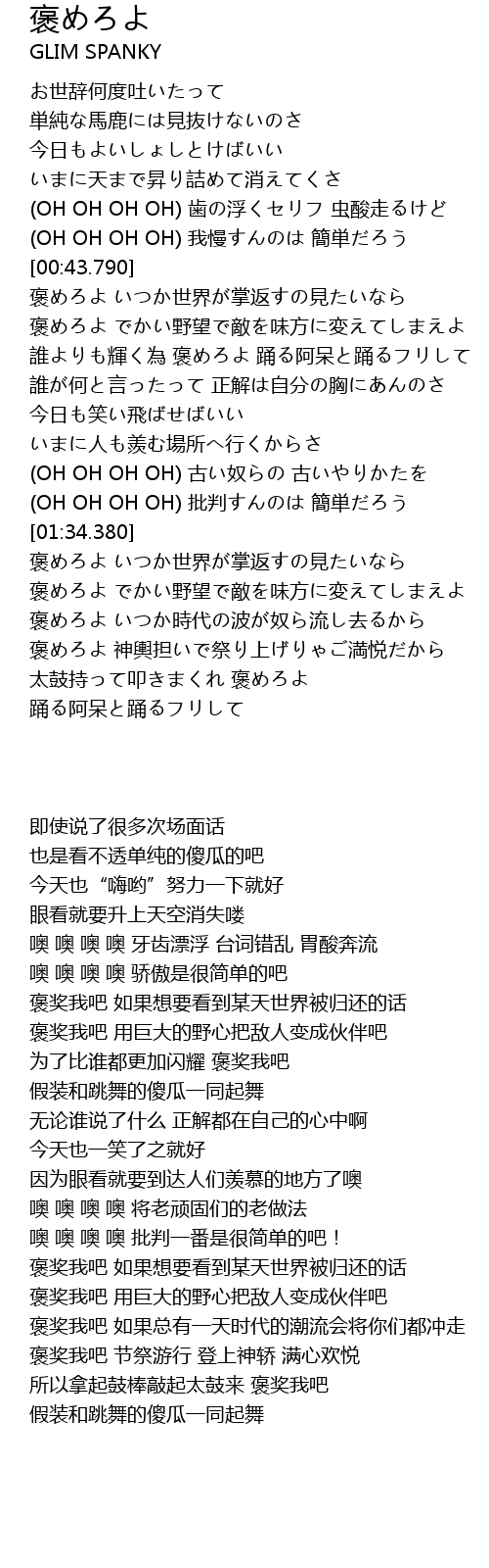 | [01:41.380] | 褒奖我吧 用巨大的野心把敌人变成伙伴吧 |