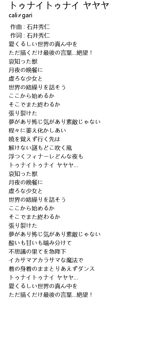 | [02:02.66] | トゥナイトゥナイ ヤヤヤ… |
