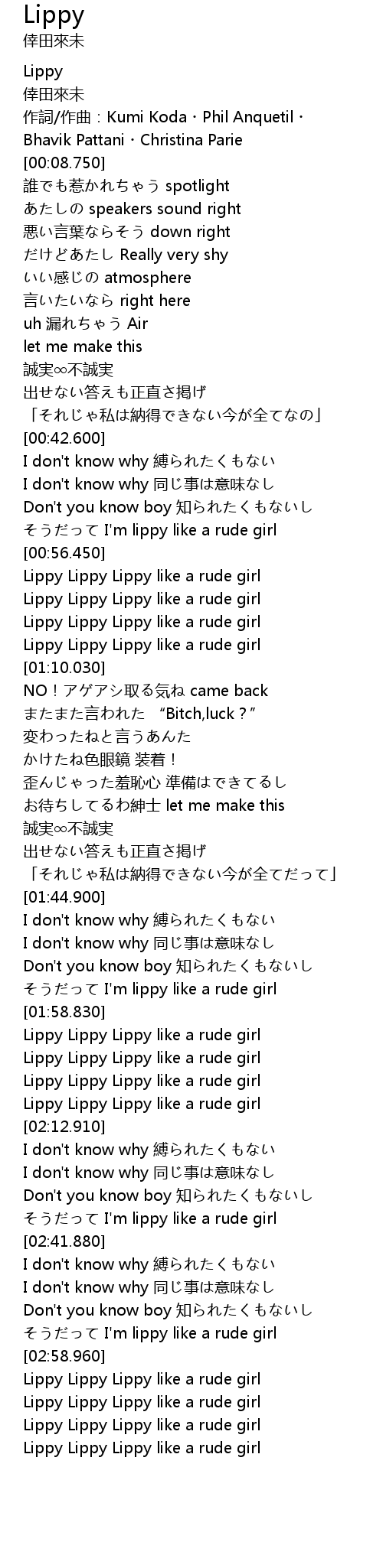 | [02:59.560] | Lippy Lippy Lippy like a rude girl |