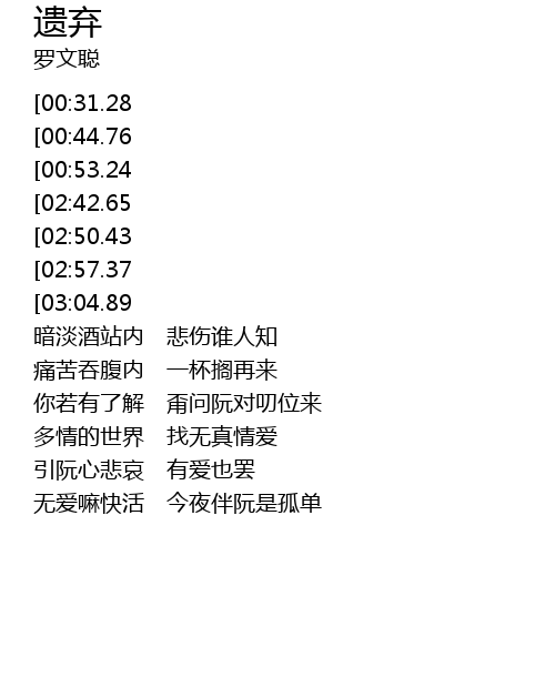 | [03:45.38][02:42.65][00:59.35] | 我的爱被你遗弃 抛得远远地 |