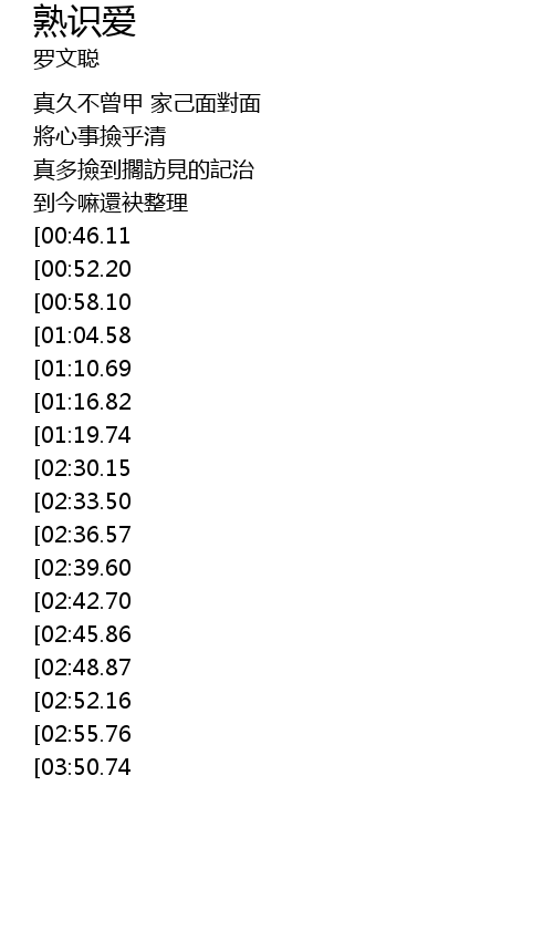 | [03:35.04][02:42.70][01:35.01] | 乎我擱再熟識愛 |