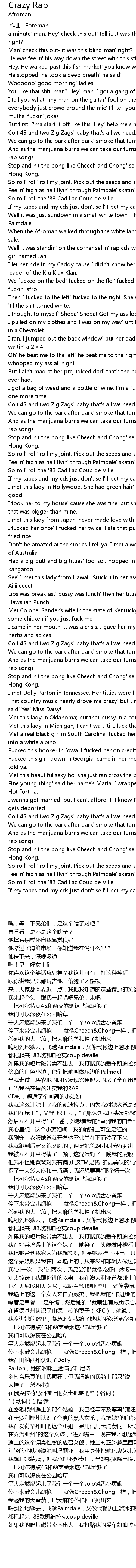 | [04:20.65] | Met a real black girl in South Carolina fucked her ' til she turned into a white albino. |