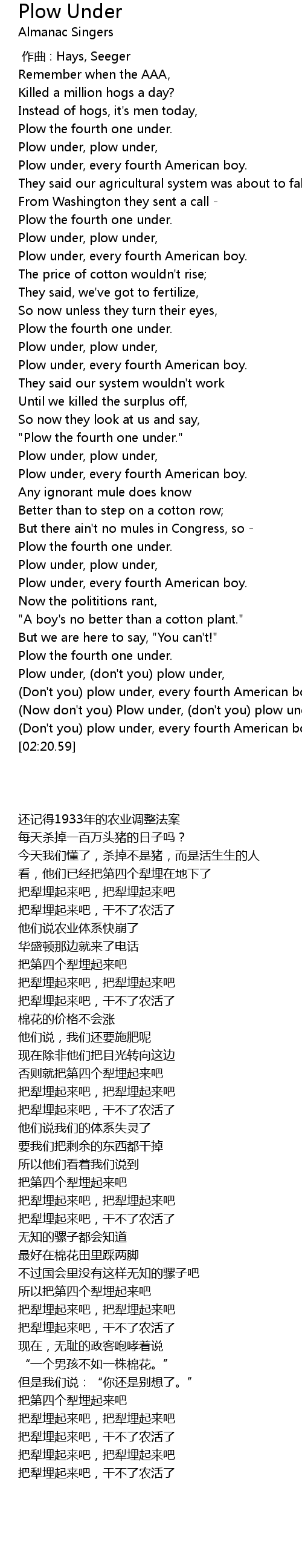 | [02:09.46] | (Now don't you) Plow under, (don't you) plow under, |