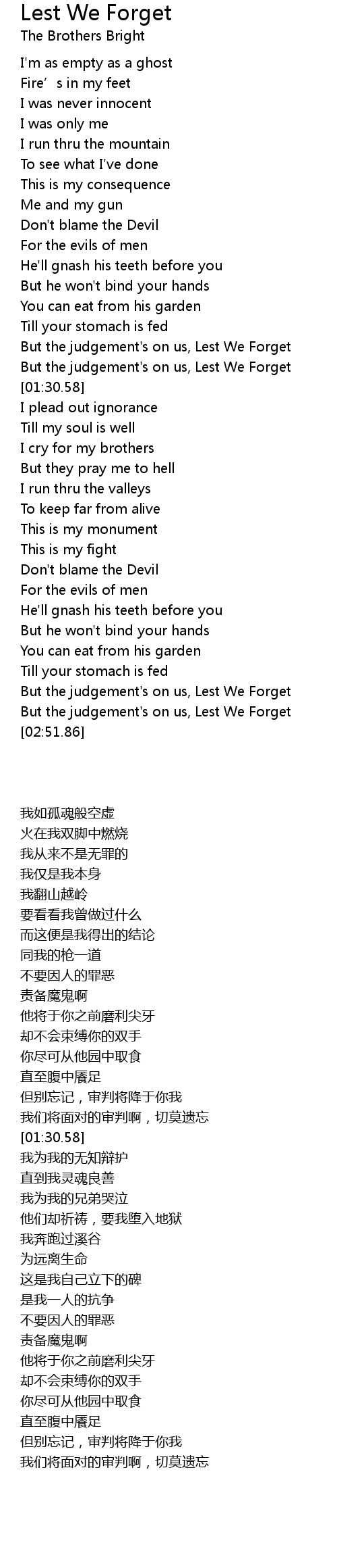 | [02:38.39] | But the judgement's on us, Lest We Forget |