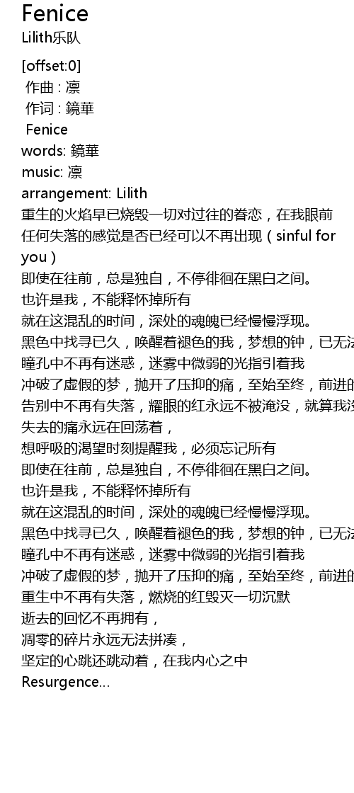 | [00:34.07] | 重生的火焰早已烧毁一切对过往的眷恋,在我眼前 |
