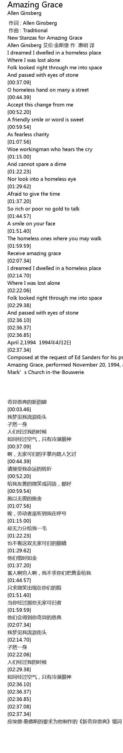 | [02:37.73] | Composed at the request of Ed Sanders for his production of The New Amazing Grace, performed November 20, 1994, at the Poetry Project in St. Mark' s Church intheBouwerie. |