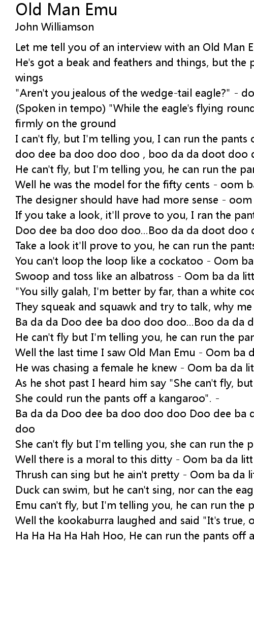 Well the last time I saw Old Man Emu - Oom ba da little da da da |