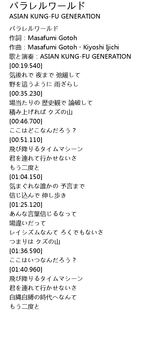 | [00:11.480] | 歌と演奏:ASIAN KUNG-FU GENERATION |