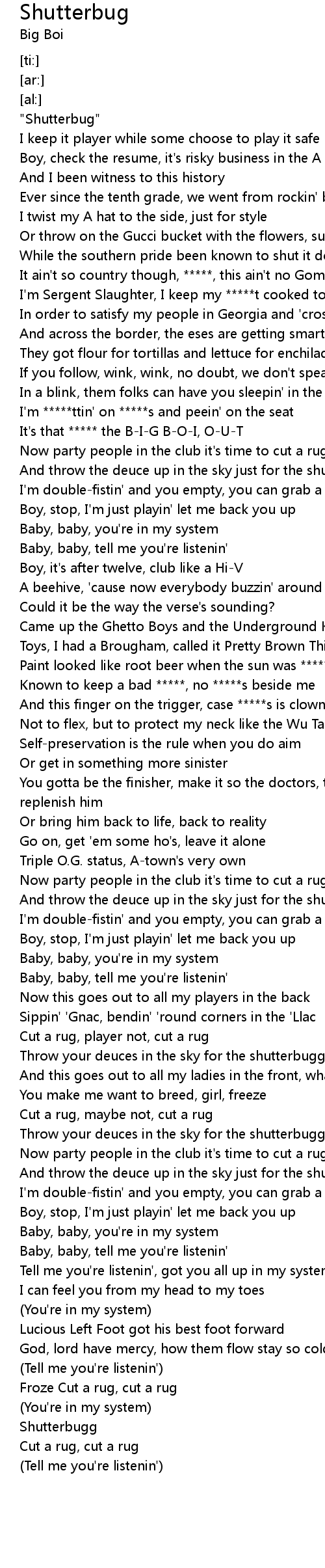 | [02:24.00] | Throw your deuces in the sky for the shutterbugg |