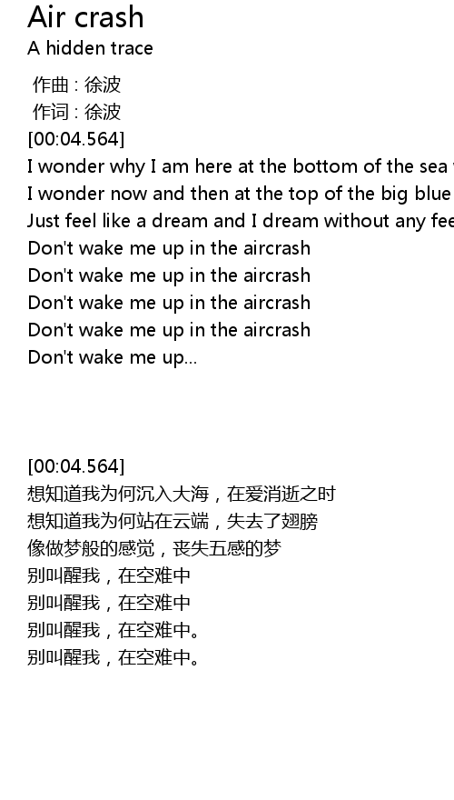 | [01:31.428] | Don' t wake me up in the aircrash |
