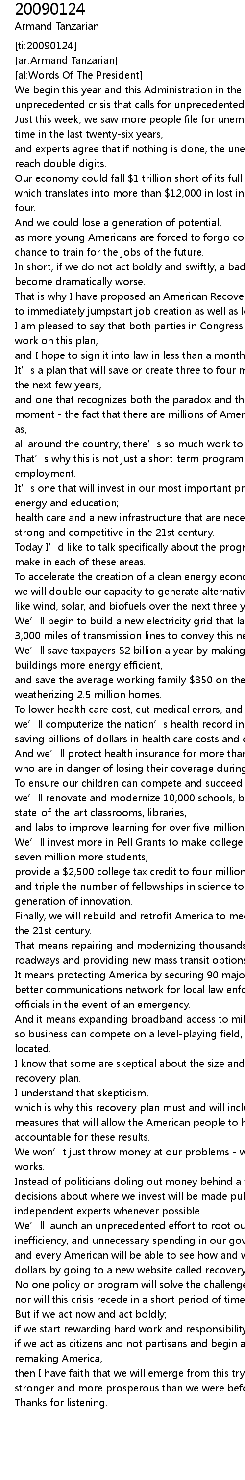 | [01:03.96] | That is why I have proposed an American Recovery and Reinvestment Plan to immediately jumpstart job creation as well as longterm economic growth. |