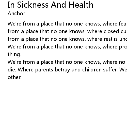 | We're from a place that no one knows, where fear reigns and shame grows. We're from a place that no one knows, where closed curtains hide stories of war. We're from a place that no one knows, where rest is uncertain and love compromised. We're from a place that no one knows, where promises are words that don't mean a thing. | |