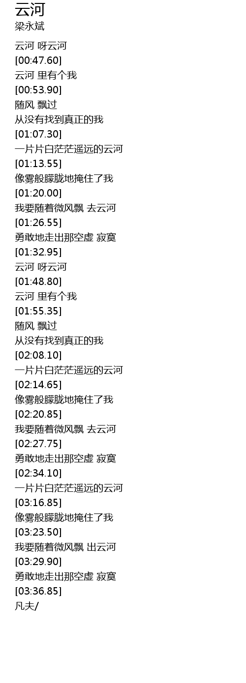 | [03:25.60] | 我要随着微风飘 出云河 |