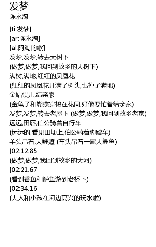 | [00:09.40] | 发梦,发梦,转去大树下 (做梦,做梦,我回到故乡的大树下) |