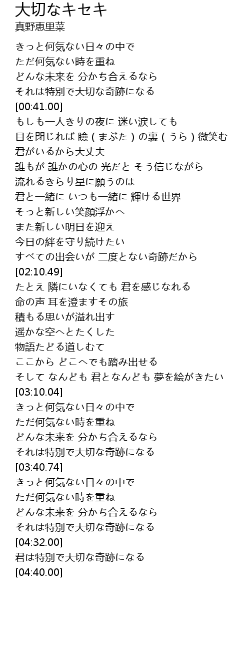 | [04:32.02] | 君は特別で大切な奇跡になる |
