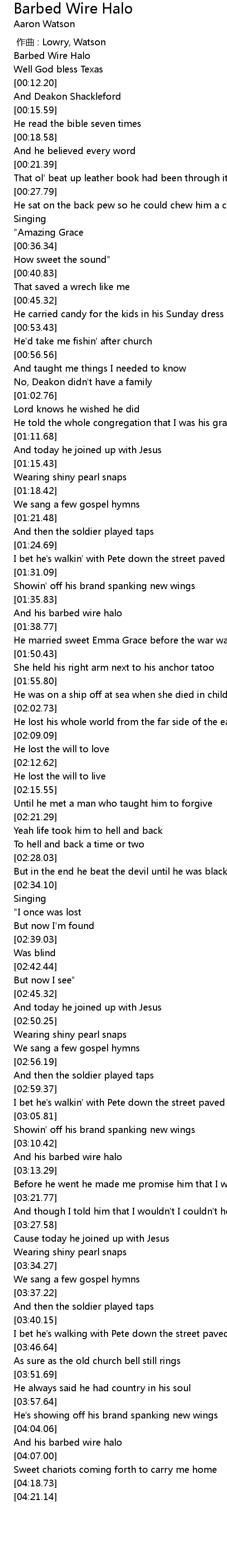 | [00:28.54] | He sat on the back pew so he could chew him a chaw |