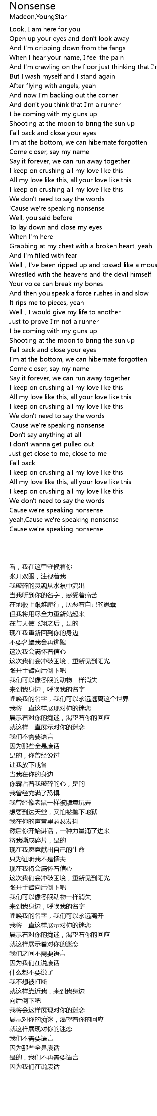| [03:20.84] | Cause we' re speaking nonsense |