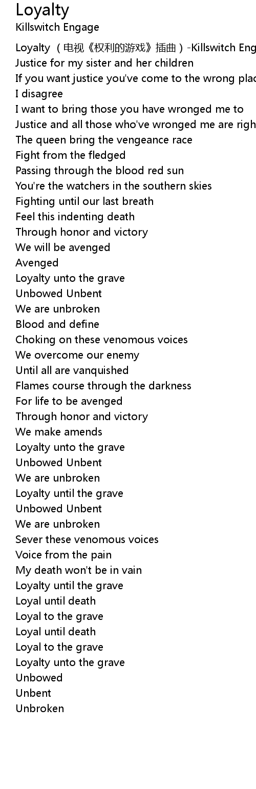 | [00:00.91] | Loyalty (电视《权利的游戏》插曲)-Killswitch Engage |