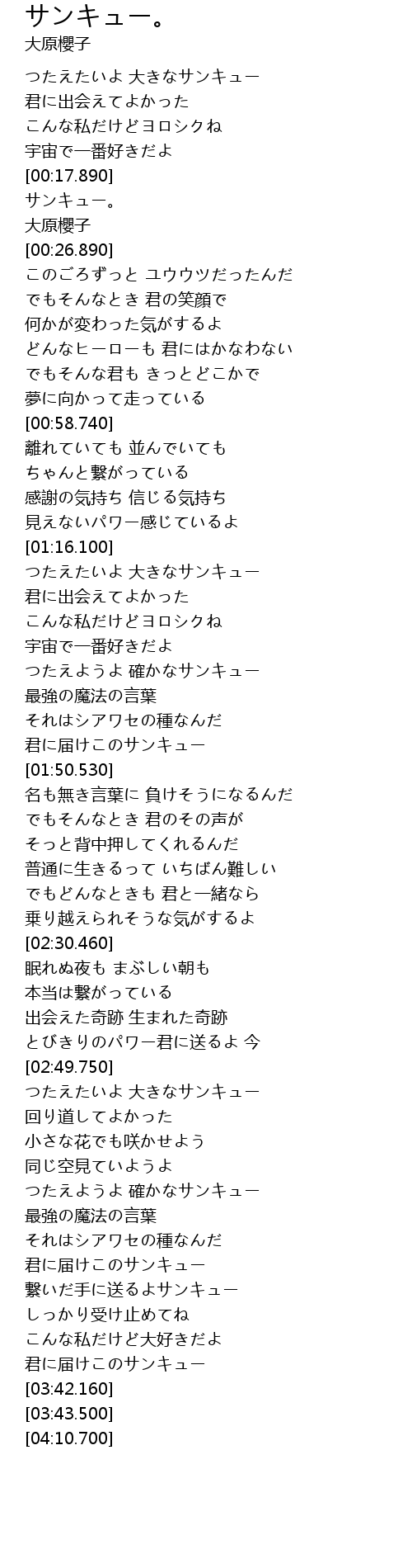 | [01:17.170] | つたえたいよ 大きなサンキュー |
