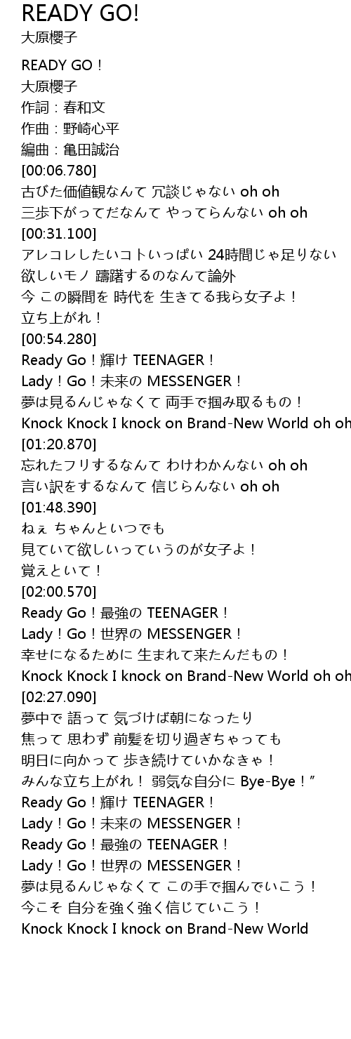 | [02:06.370] | Lady!Go!世界の MESSENGER! |