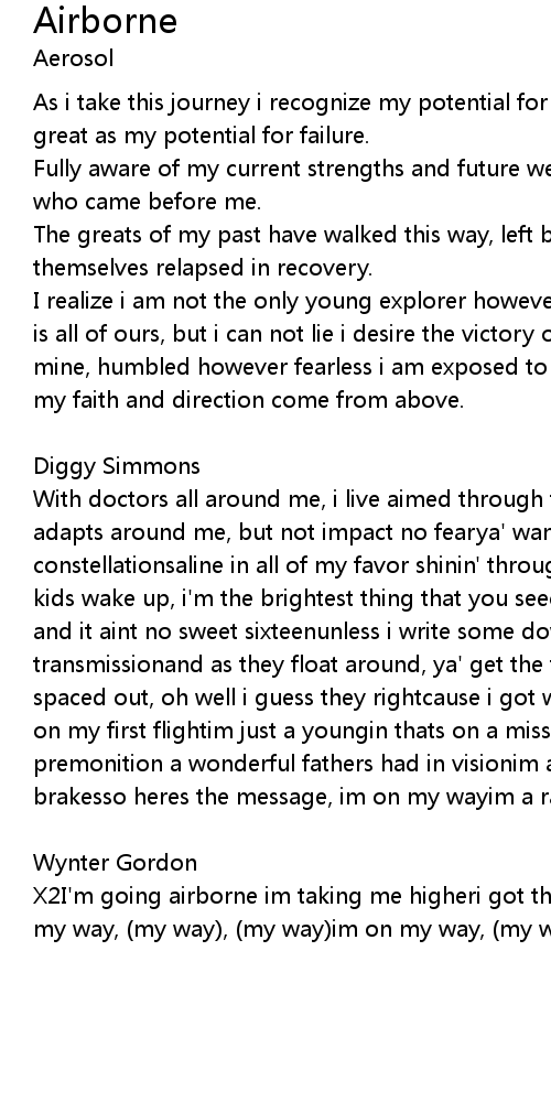 | With doctors all around me, i live aimed through the atmospherenotions and adapts around me, but not impact no fearya' want the celebrations, i want the constellationsaline in all of my favor shinin' through all the nationso when you kids wake up, i'm the brightest thing that you seecause i got my mind made up, and it aint no sweet sixteenunless i write some down trend set and transmissionand as they float around, ya' get the first additionsome said im spaced out, oh well i guess they rightcause i got whole nother outlook i told ya on my first flightim just a youngin thats on a mission for the world to listenan premonition a wonderful fathers had in visionim a rappers delight, these are the brakesso heres the message, im on my wayim a rare form, in rare form, young diggy im airborne[hook] | |