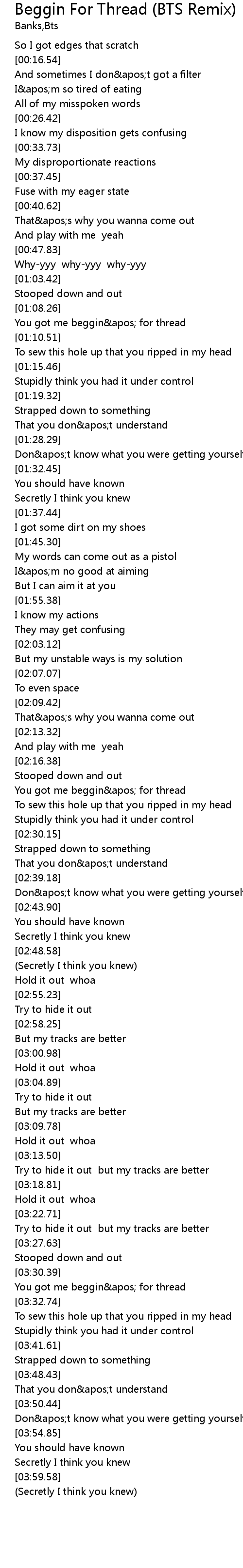 [03:30.92] You got me beggin' for thread