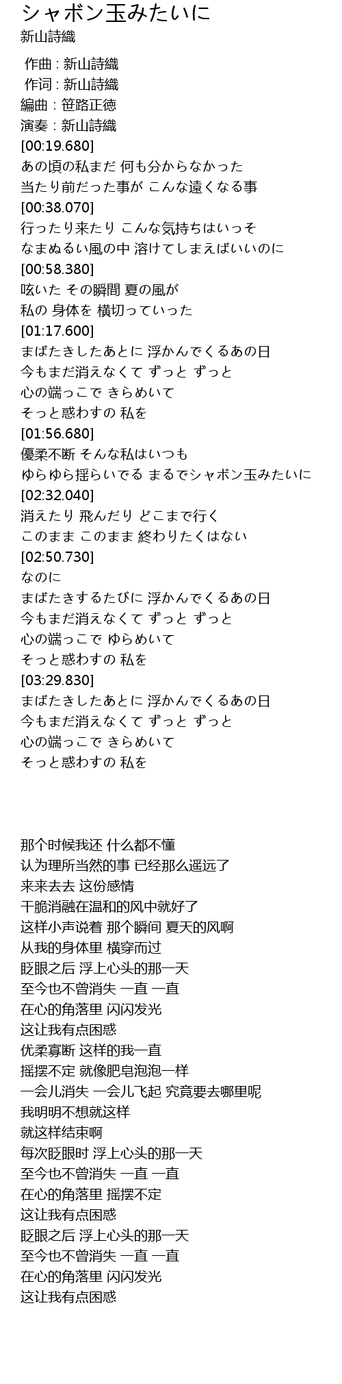 | [02:23.070] | ゆらゆら揺らいでる まるでシャボン玉みたいに |