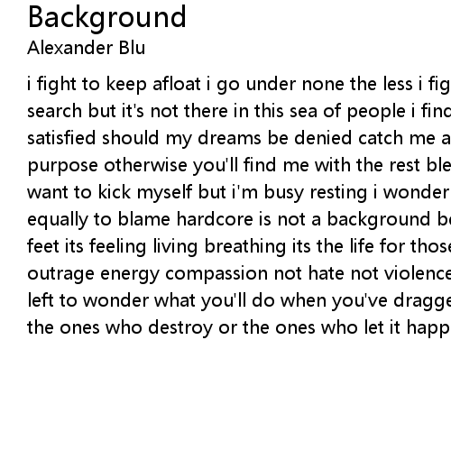 i fight to keep afloat i go under none the less i fight for a breath of air search but it's not there in this sea of people i find i am not an equal i'm not satisfied should my dreams be denied catch me at a good time see a man with a purpose otherwise you'll find me with the rest blending into the background i want to kick myself but i'm busy resting i wonder why i complain when i'm equally to blame hardcore is not a background beat for you to move your dancing feet its feeling living breathing its the life for those who love living its outrage energy compassion not hate not violence or fashion so i ask you and i'm left to wonder what you'll do when you've dragged it under find who's to blame the ones who destroy or the ones who let it happen