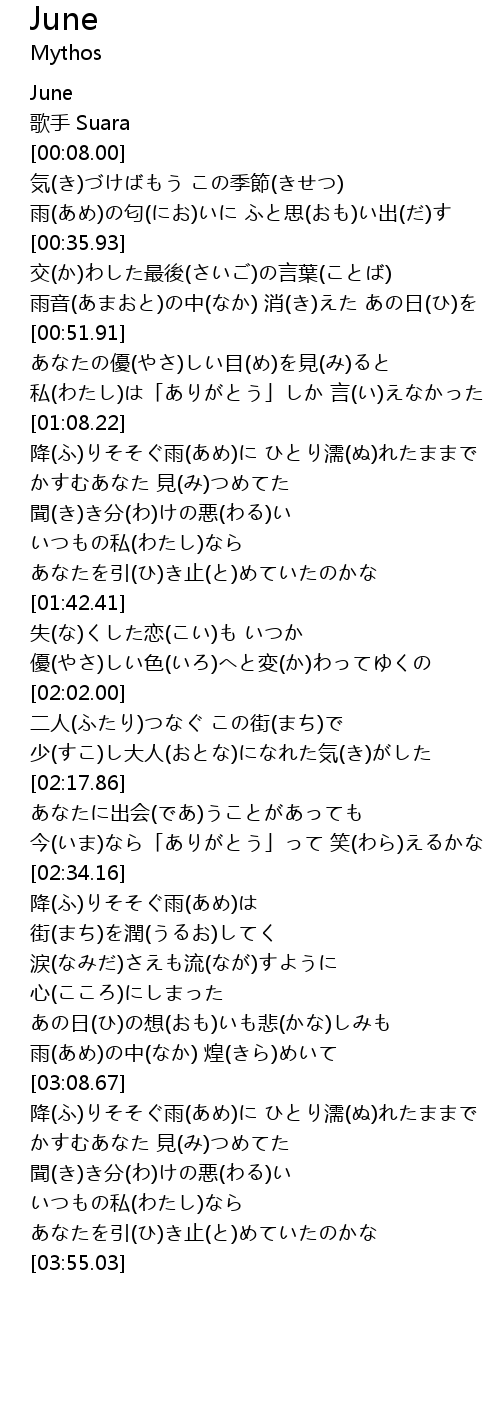 | [00:44.48] | 雨音(あまおと)の中(なか) 消(き)えた あの日(ひ)を |