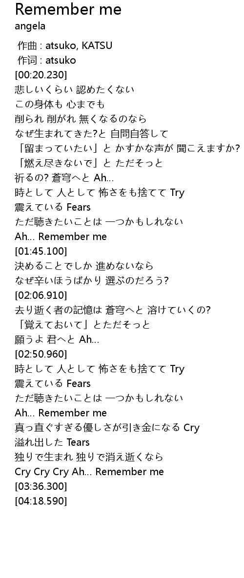 | [03:27.480] | Cry Cry Cry Ah… Remember me |