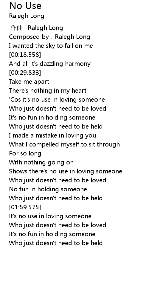 | [01:37.507] | Shows there' s no use in loving someone |
